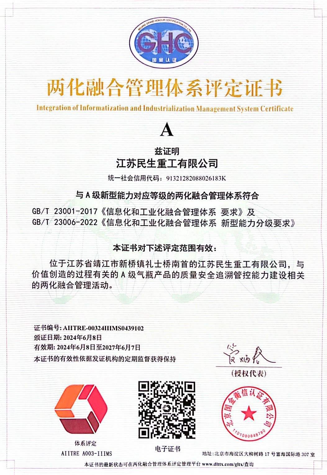 兩化融合管理體系評(píng)定證書(shū)